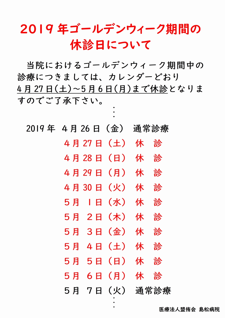 当院における2019年ゴールデンウィーク期間中の外来診療はカレンダーどおり、4月27日~5月6日まで休診となりますのでご了承下さい。