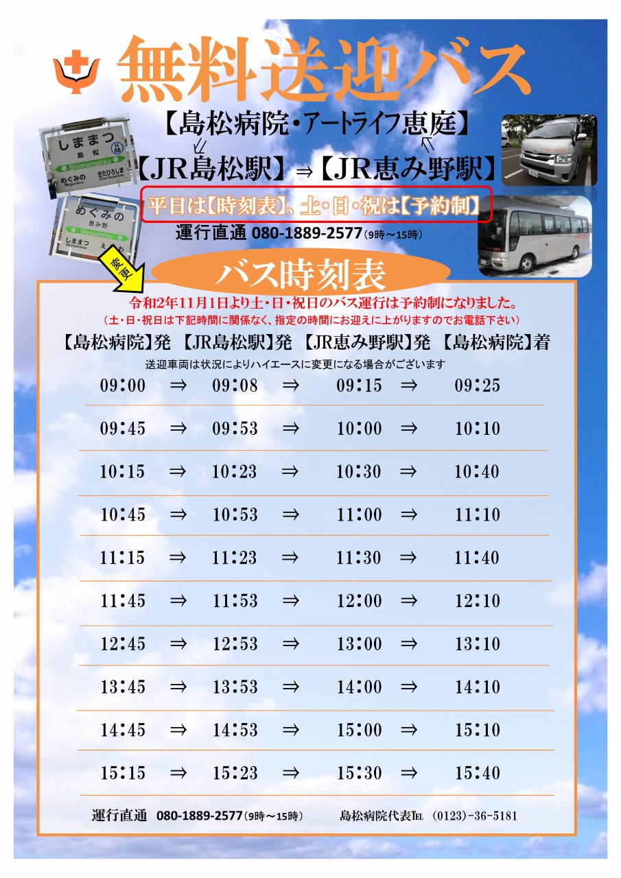 土曜・日曜・祝日に乗車を希望される方は以下の携帯番号に直接お電話頂くか、島松病院・アートライフ恵庭の代表番号にご連絡頂き、乗車場所(JR島松駅・JR恵み野駅・島松病院・アートライフ恵庭)と乗車予定時間をお申し出下さい。