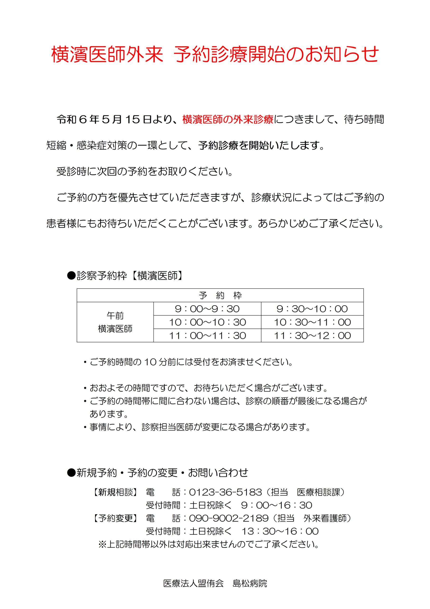 令和6年5月15日より横濱医師の外来診療につきまして、予約診療を開始いたしました。